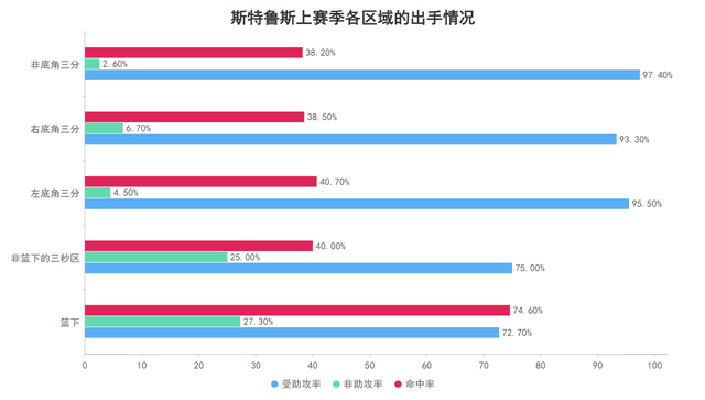 上赛季的斯特鲁斯除了中投几乎没有外,在各个区域的得分受助攻率都显著的大于非助攻率,因此他是一名较为依赖队友为他创造空切篮下与三分线外投射机会的球员,而无论是哪个区域的三分球他都较为均衡没有明显的低效区。