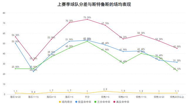 上赛季当骑士与对手分差在落后5分到领先5分之间时,斯特鲁斯的投篮命中率、三分命中率与结合三分罚球情况的真实命中率均达到了最高的水准,而随着落后与领先的越多那么他的各项命中率会出现较多的下滑,这意味着当骑士面临分差较劲的焦灼时刻时斯特鲁斯的得分更有效率也更加值得信赖,因此他的赛季命中率看似不算最顶尖,但却是能助球队打破僵局度过难关的那个人。